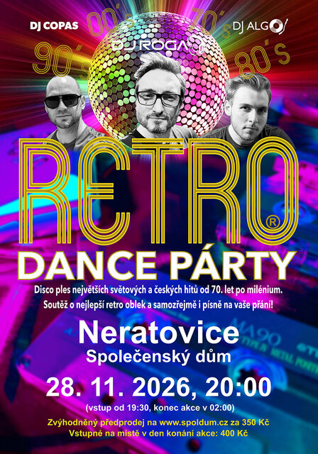 Během našeho podzimního turné nemůžeme samozřejmě chybět v Neratovicích! RETRO DANCE PÁRTY je šesti hodinový disco ples těch největších hitů osmdesátých a devadesátých let s přesahem na léta sedmdesátá až po milénium. Zkrátka od Abby, přes Modern Talking až po Shakiru. Přijďte klidně v džínech, ale nejlépe retro! Nejlepší dobové kostýmy budou odměněny! Těšit se můžete na skvělou světelnou show, lasery, soutěže a mnoho dalšího! Doba je zlá, tak tancujme, dokud můžeme!
